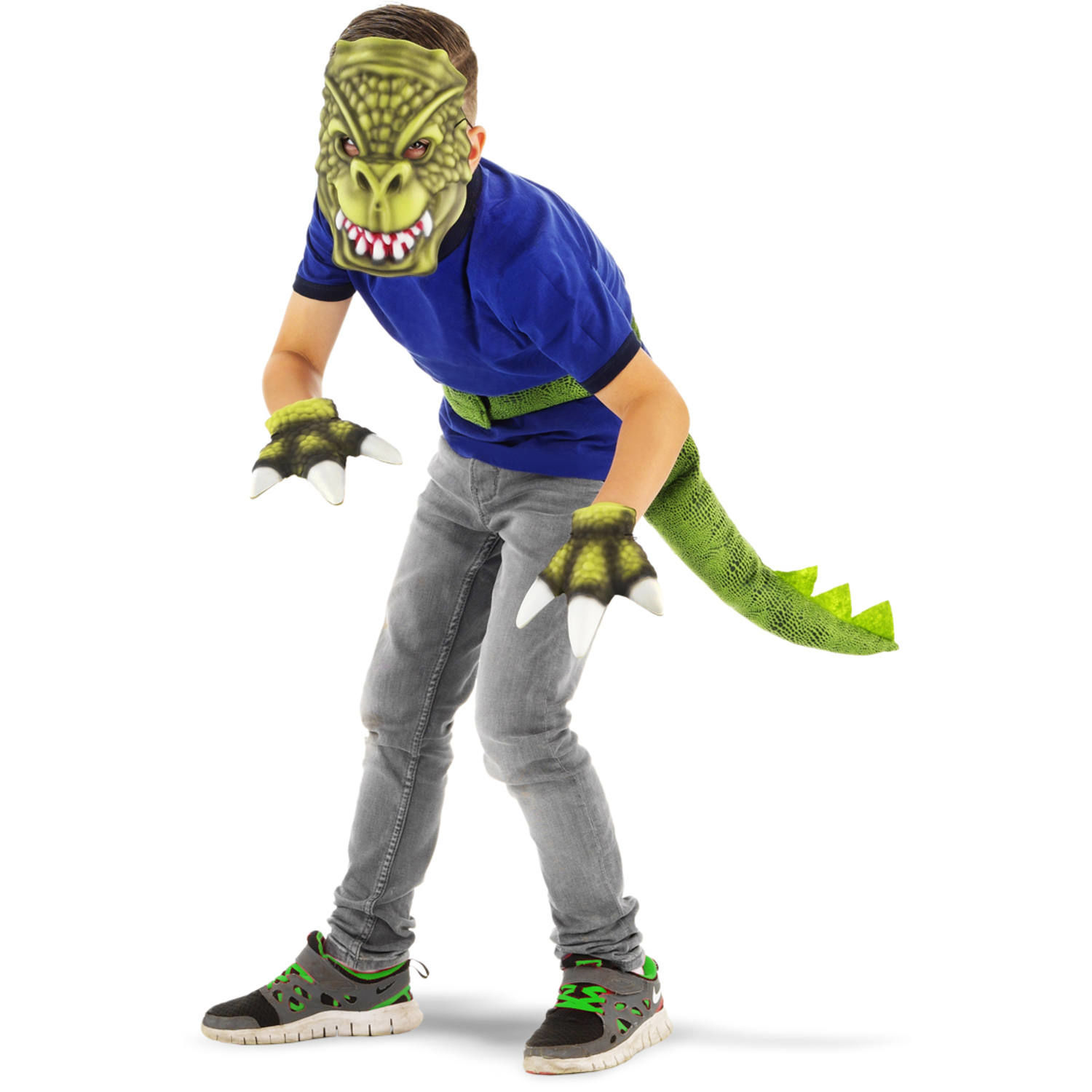 Dinosaur Costume Set 3 pieces - Children's Size. Contents: Mask, Tail, Gloves. Colour: Green. You can wear the costume nicely during Carnival, Theme parties, Children's party. Clothing size specification: 116-134, One Size Fits Most. The costume is made of polyester.