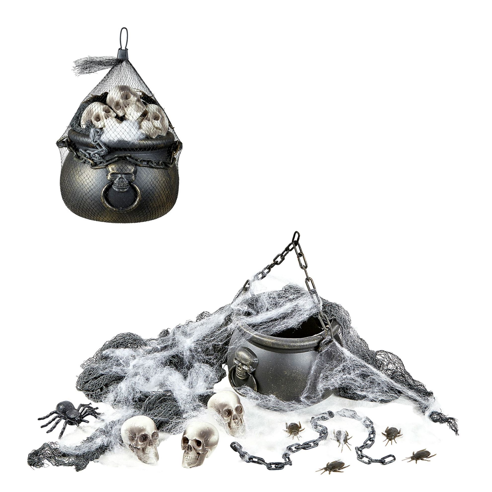 "HALLOWEEN DECORATIVE SET" (cauldron, 3 skulls, spiderweb & spider, ch..