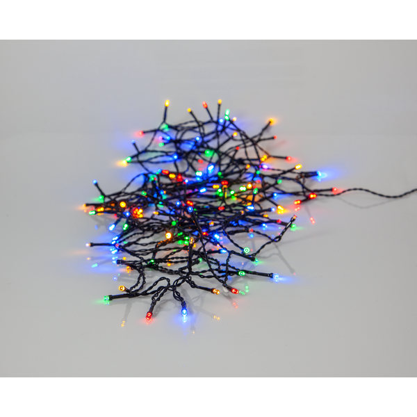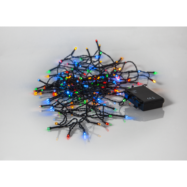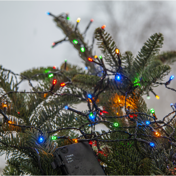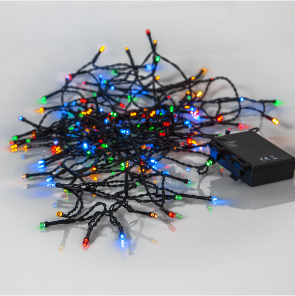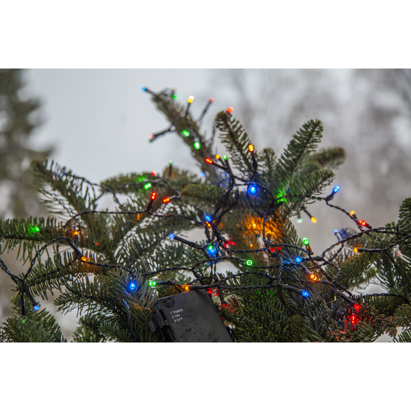 Light chain with 160 multi coloured LED lights and with battery box for in- or outdoor use, run by 3xAA batteries. For optimal battery life, the light chain has repeating timer function, 6h on and 18h off. Item easy to place in your garden for a cozy light.