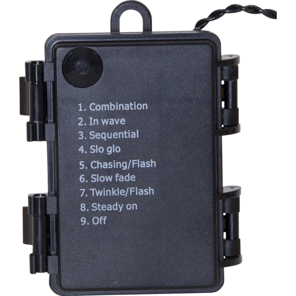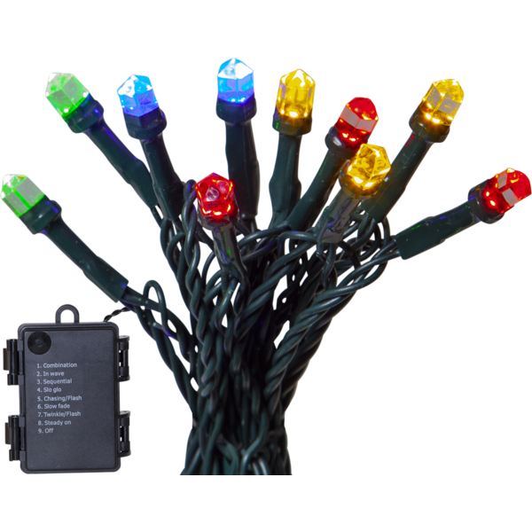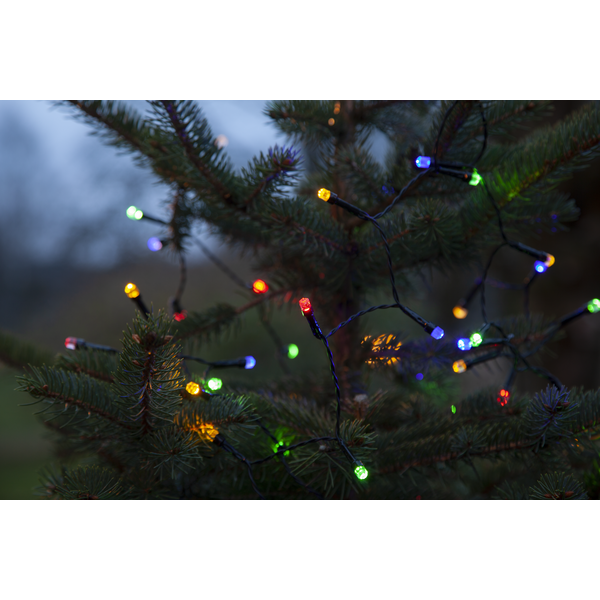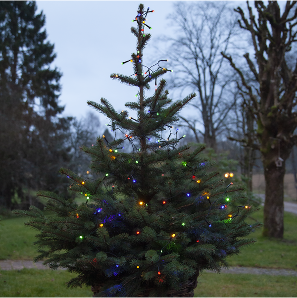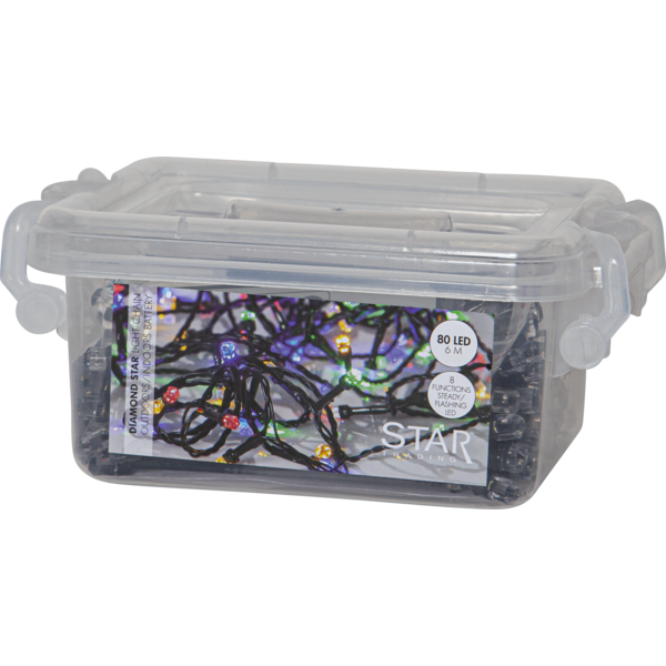 Light chain with 80 multi coloured lights for outdoor use with black cable. The covers gives the light a star reflection. Nice to decorate with in your garden and in your christmas tree. Battery operated with 8 function chaser box and timer function. The light chain is delivered in a plastic box with handle, perfect for storing when the light chain is not in use.