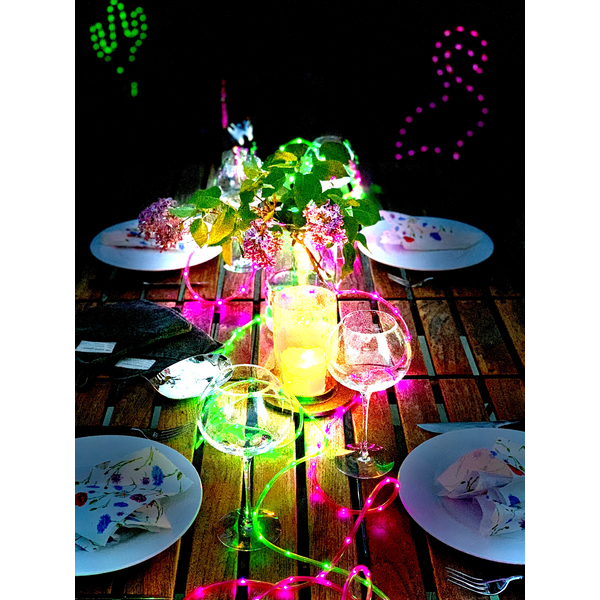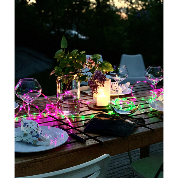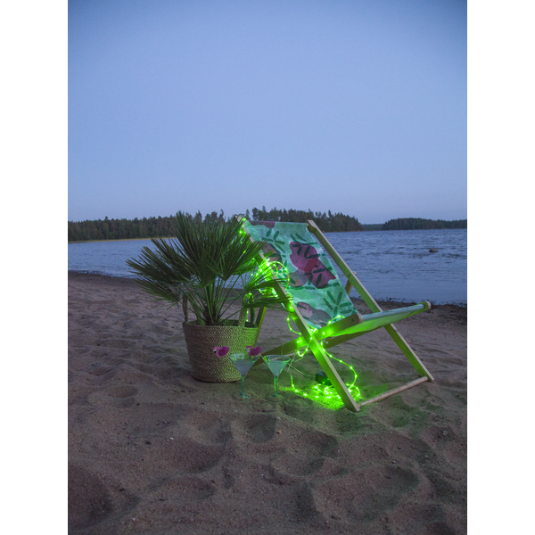 Create partymood with this 5m light chain in green LED. Battery box for outdoor use. Timer