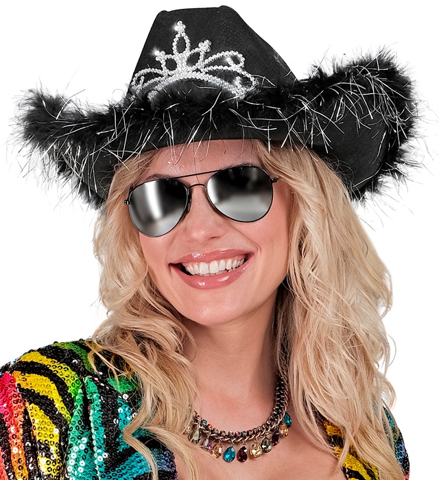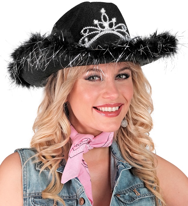 "BLACK COWGIRL HAT" with tiara & marabou trim with silver tinsel - in ..