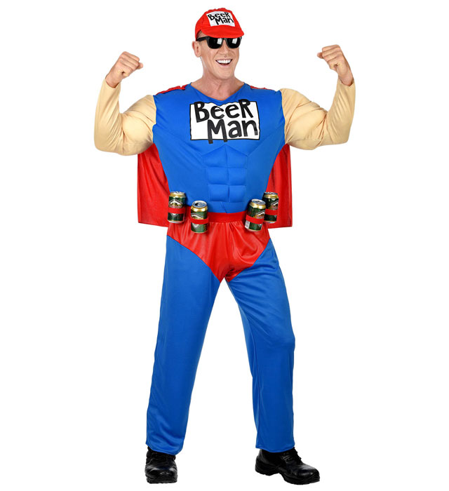 "SUPER BEER MAN" (muscle overalls with cape, can holster belt, cap)
